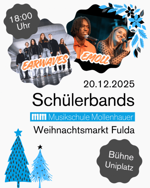 Am Samstag, den 20. Dezember 2025 um 18:00 Uhr könnt ihr unsere Schülerbands @duo.emoll und @earwaves_rockpopcoverband live erleben. 🤘